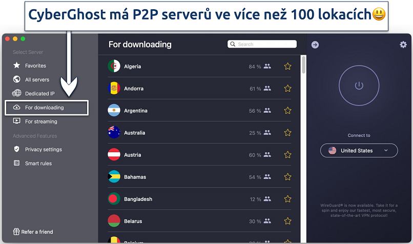 CyberGhost má speciální servery optimalizované pro stahování torrentů. Neustále je udržuje, aby zajistila jejich funkčnost a zlepšila jejich výkonnost. Když jsem se připojil ke švýcarskému P2P serveru, dosáhl jsem pro torrenty vysokých rychlostí – jen 5 % pod mou základní rychlost. Torrenty podporují i běžné servery, ale jejich rychlost nebyla v mých testech tak konzistentní.
