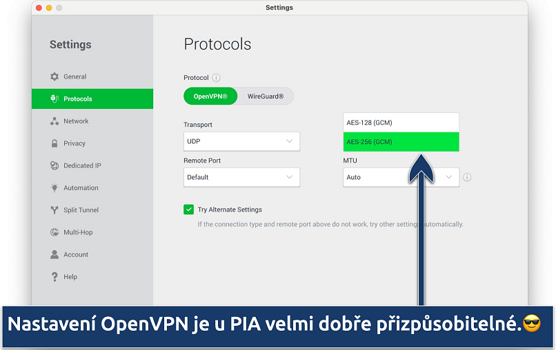 3. Private Internet Access – nastavitelné funkce pro přizpůsobení vašeho připojení k torrentům