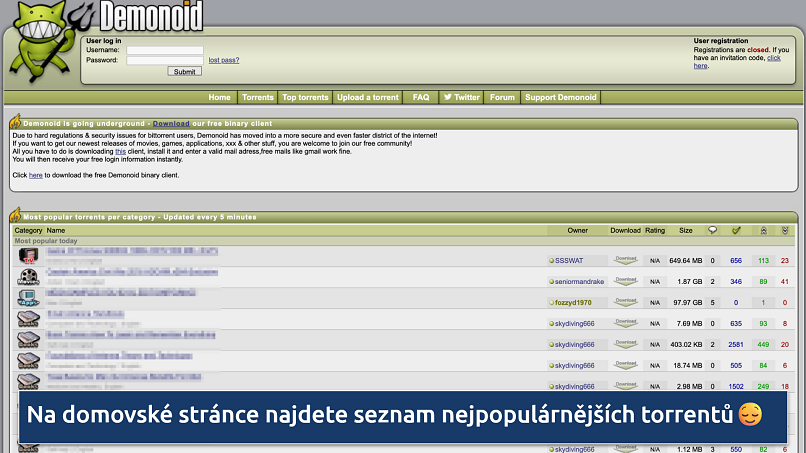 Na Demonoidu už nejde stahovat torrenty bez účtu. Na domovské stránce je také uvedeno, že si musíte pro stahování obsahu nainstalovat partnerskou VPN.